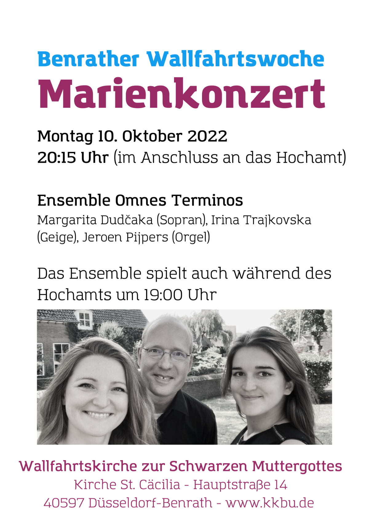 Wir laden herzlich ein zu einem Marienkonzert in St. Cäcilia am Montag, den 10. Oktober 2022 um 20.15 Uhr (im Anschluss an das Hochamt). Es spielt das Ensemble Omnes Terminos.